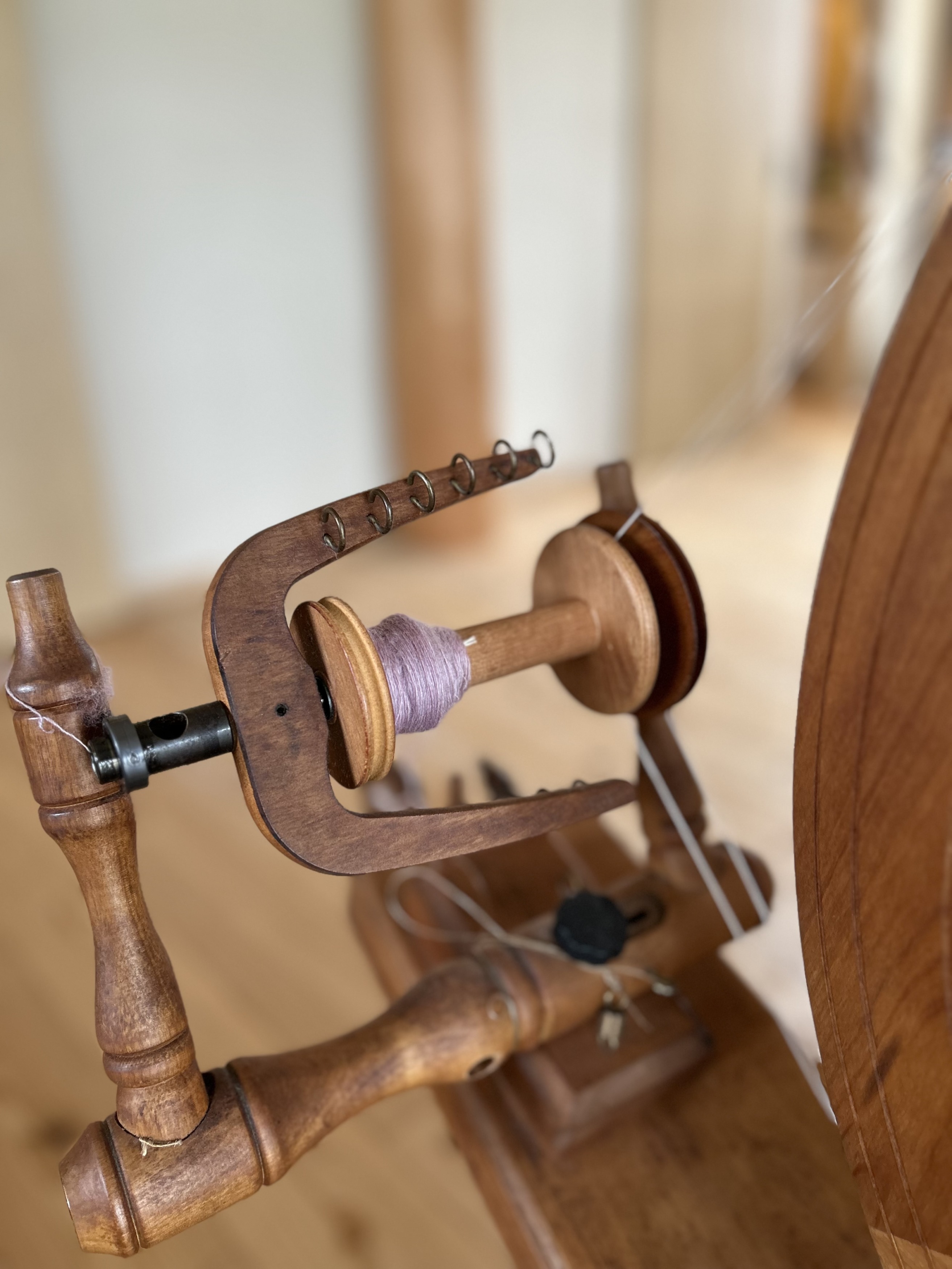 前に仕込んでおいた薄紫の糸を紡ぎ始めています。
