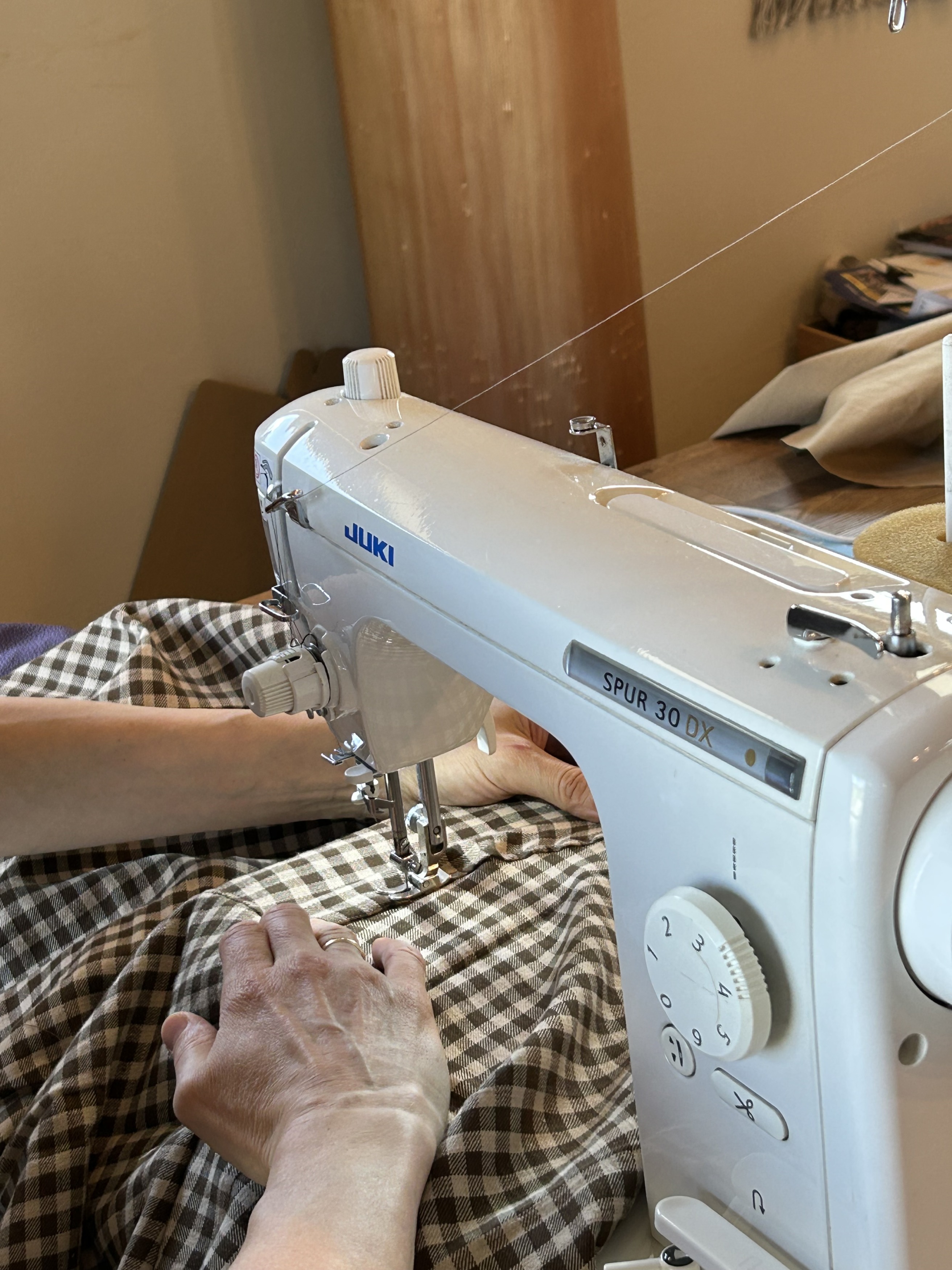 初参加の背の高い彼女はミシンを使うのは初めてですが、栗色の格子柄のワンピースに挑戦しました(手縫いは得意な方です)