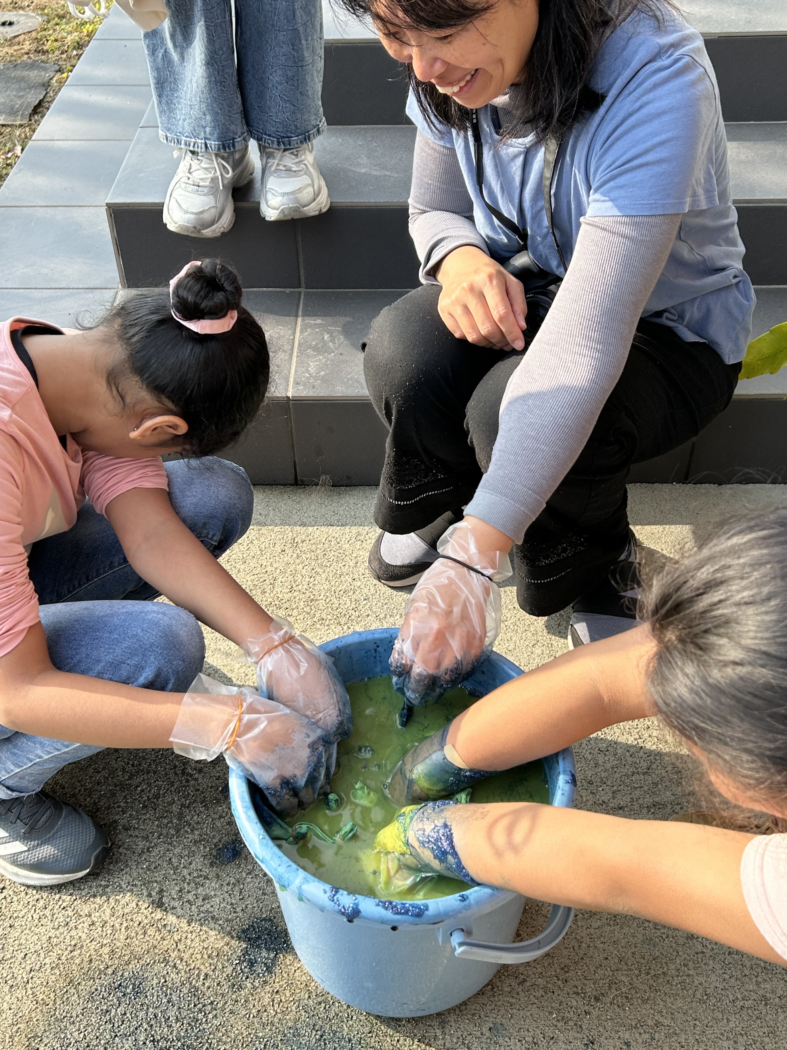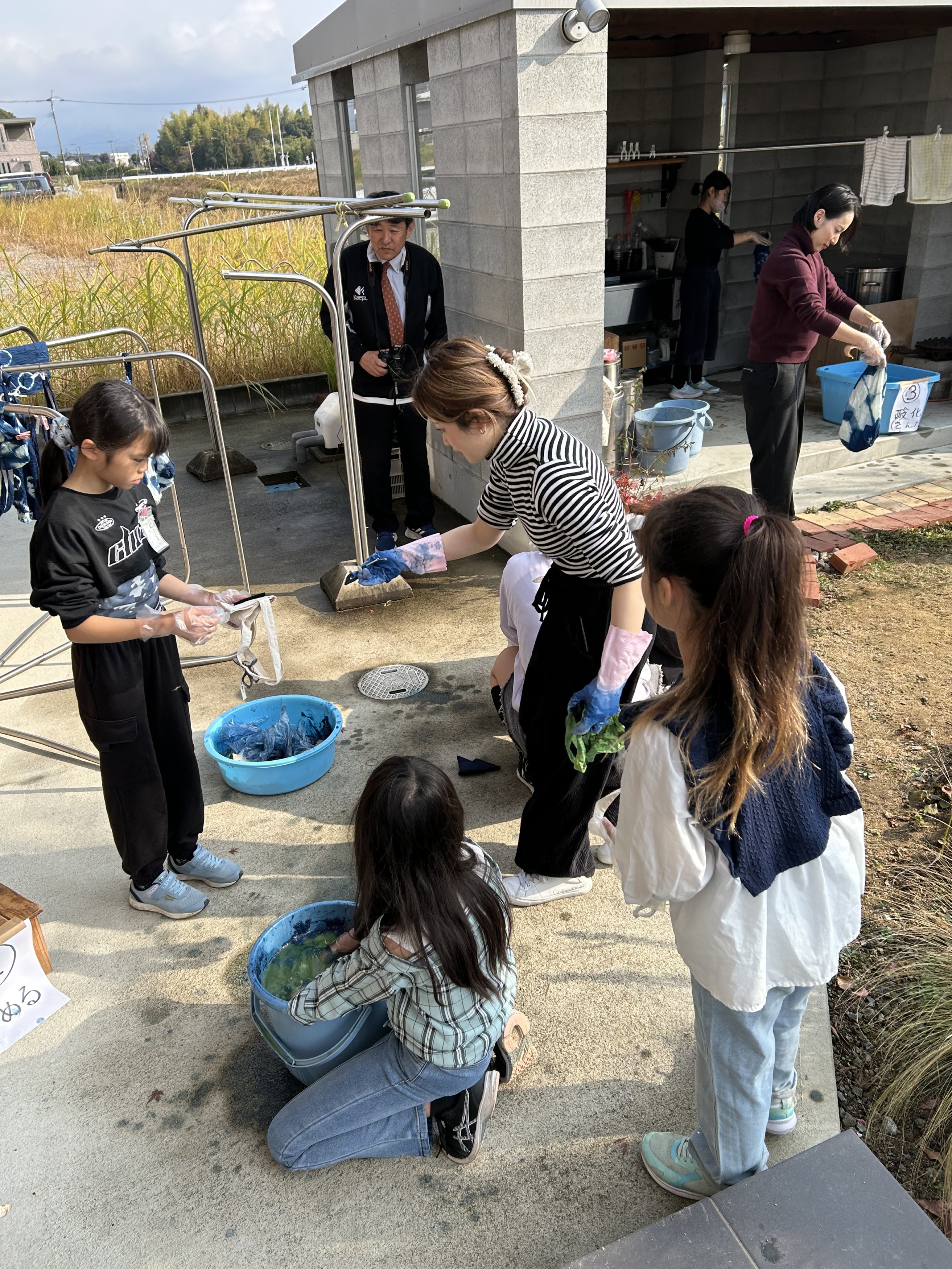 臭いと言って藍液に手を突っ込めない小学生。