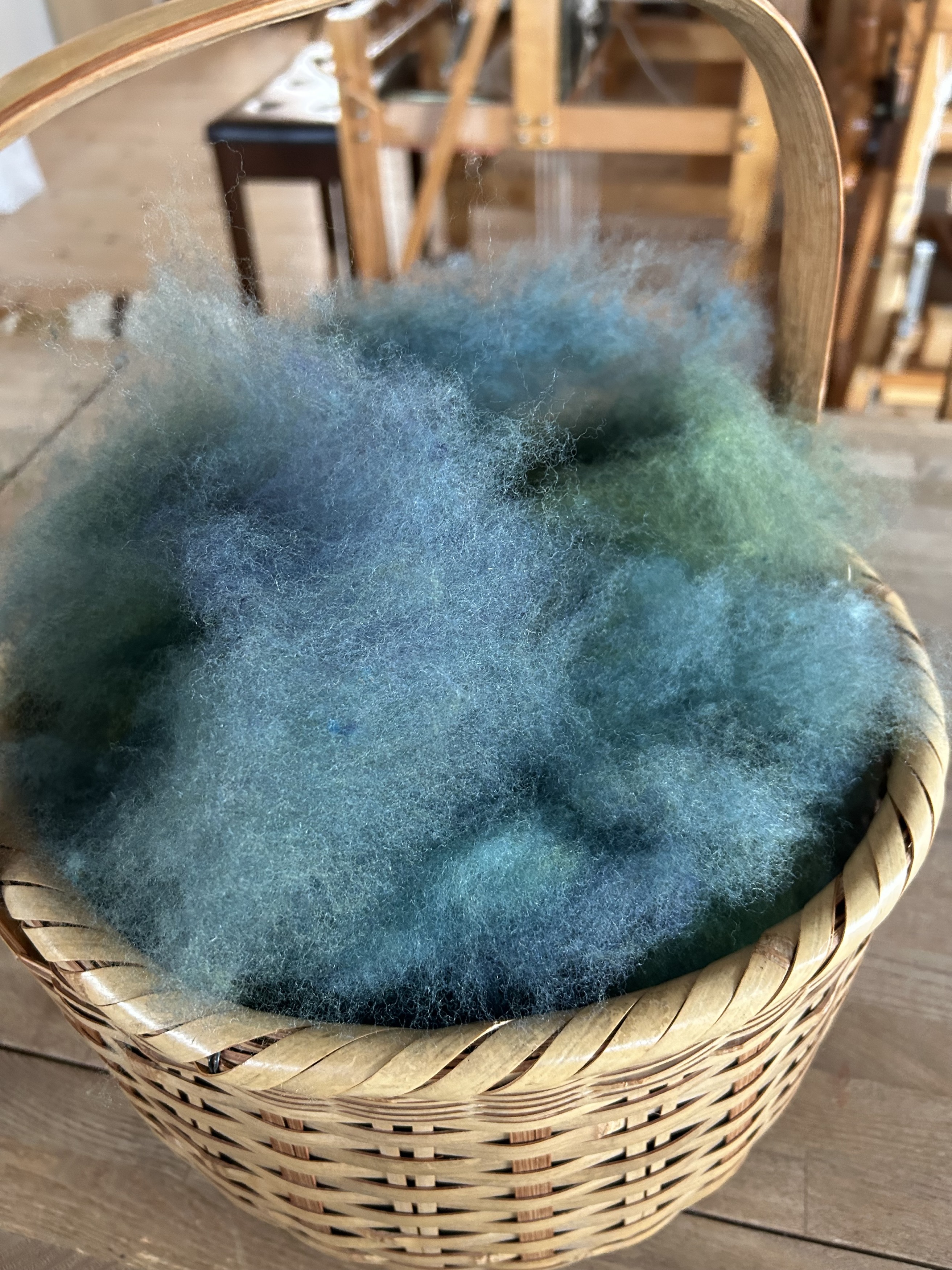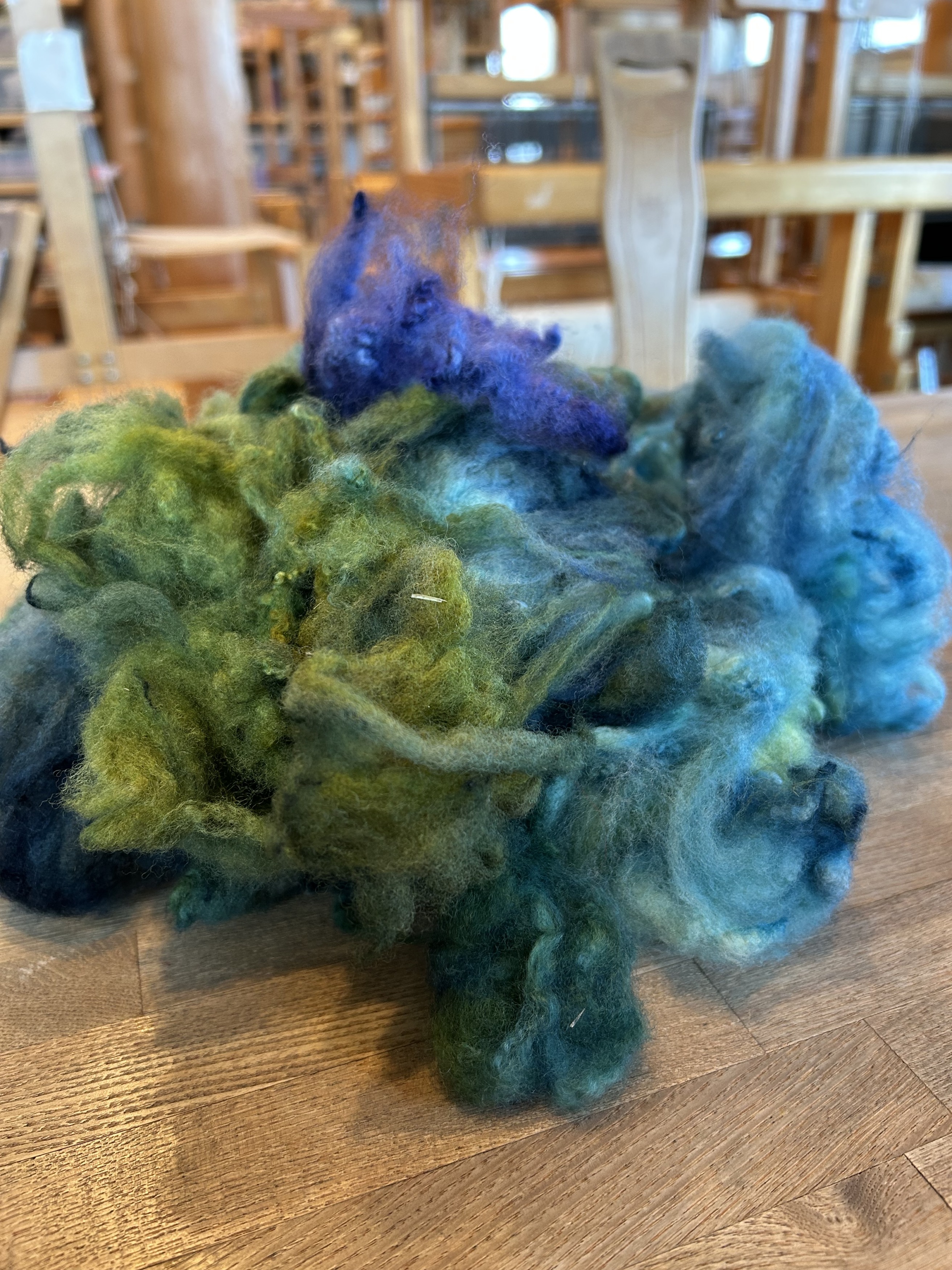 グリーン系に染めた原毛を選びました。ハンドカードも久しぶりです。
