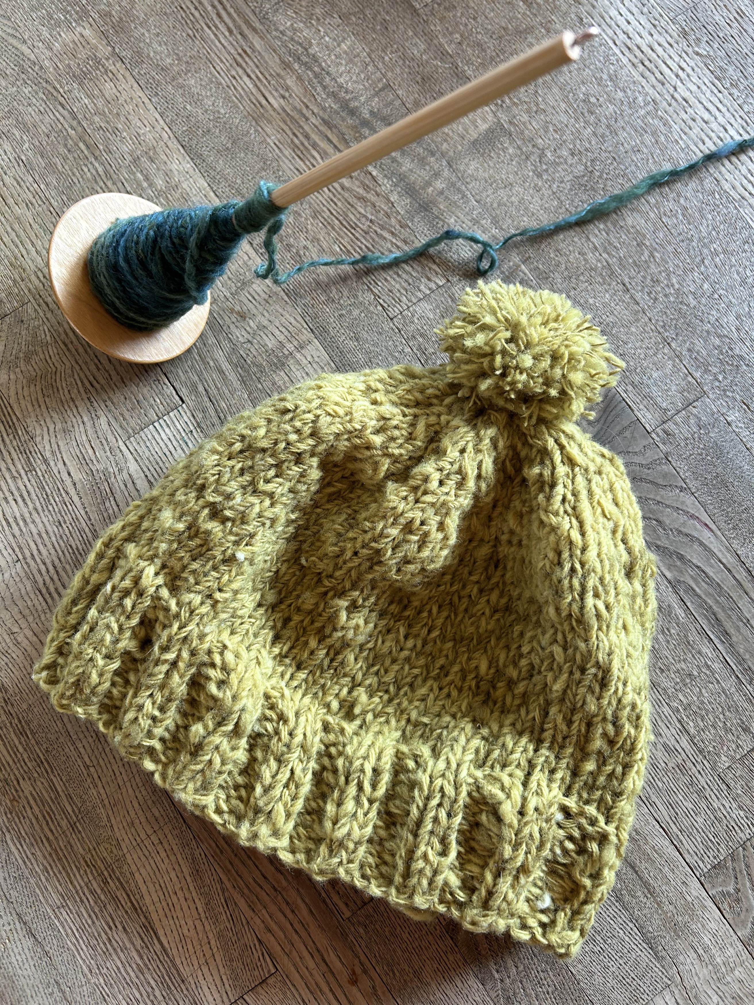 そうなんです、帽子を編もうと糸を紡いでいます。